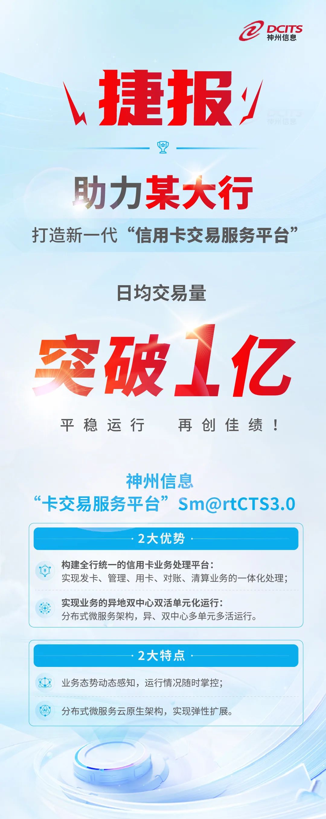近日,BB贝博艾弗森官网助力某大行打造的新一代“信用卡交易服务平台”日均交易量突破1亿大关,为业务的平稳运行提供了有力保障。